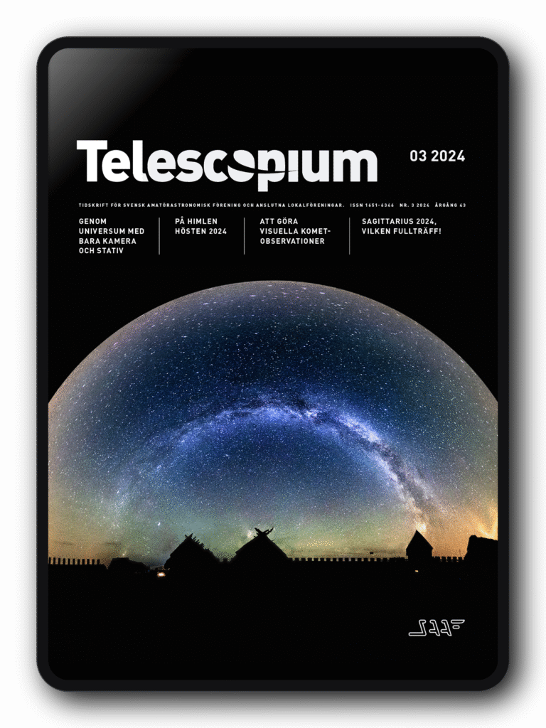 För dig som inte är medlem i SAAF eller som är medlem och ännu inte har aktiverat ditt användarkonto för att logga in på saaf.se, finns här ovan ett öppet digitalt provexemplar av Telescopium av ett äldre nummeratt läsa.